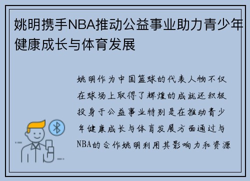 姚明,这位中国篮球的传奇巨星,以其卓越的球技和高大的身材在国际篮坛留下了深刻的印记。他不仅是NBA历史上最具影响力的亚洲球员之一,更是中美文化交流的重要桥梁。本文将从四个方面探寻姚明背后的传奇故事与文化传承:首先,姚明的成长经历与篮球启蒙;其次,他在NBA的辉煌成就与挑战;接着,姚明对中国篮球发展的贡献;最后,姚明作为文化使者,如何推动中西方文化交流。通过这些方面,我们将更深入地理解这位篮球巨星背...