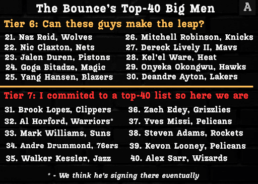 31-40分别是:31、大洛佩斯;32、霍福德;33、马克-威廉姆斯;34、德拉蒙德;35、凯斯勒;36、扎克-埃迪;37、伊夫-米西;38、亚当斯;39、卢尼;40、亚历克斯-萨尔。看完排名就能发现,杨瀚森是唯一上榜的2025届中锋。
