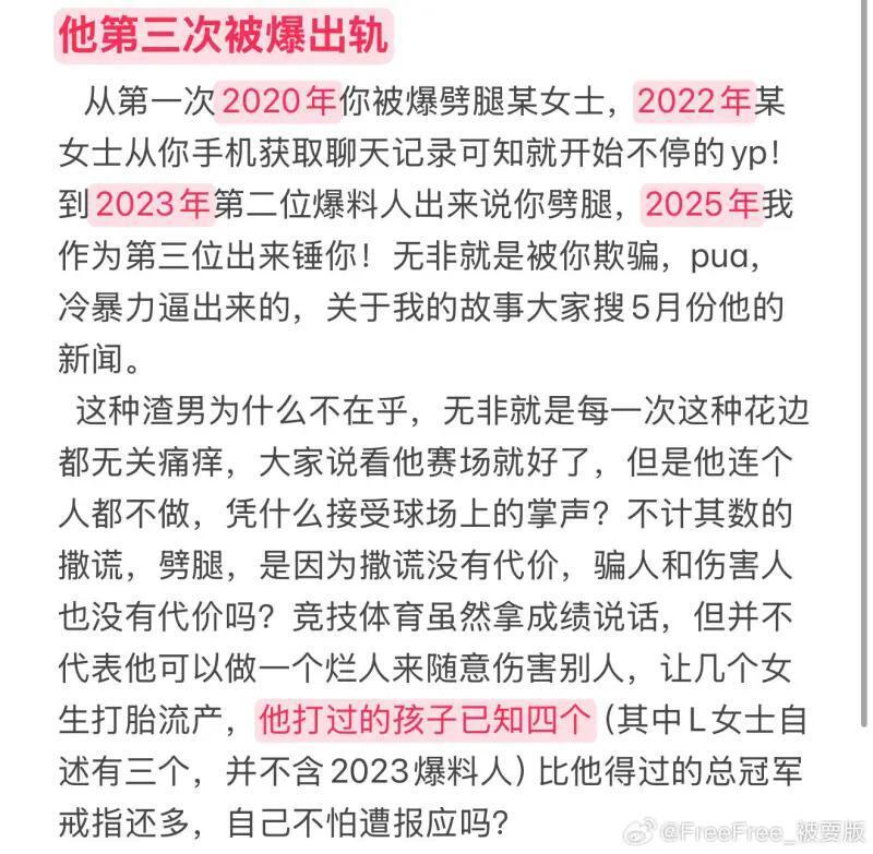 除了出轨和YP外,徐杰前女友还曝出了更加劲爆的消息,表示从2020到2025年期间,徐杰已经多次被女生出面爆锤了,甚至还有几个女生为徐杰打过胎:他打过的孩子已知有四个,比他得到的总冠军戒指还多,自己不怕遭报应吗?